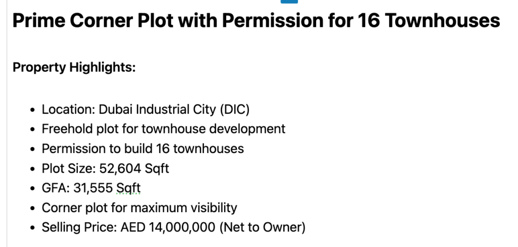 Freehold townhouse plot in Dubai Industrial City for sale with permission for 16 units prime corner plot investment opportunity net to owner.
