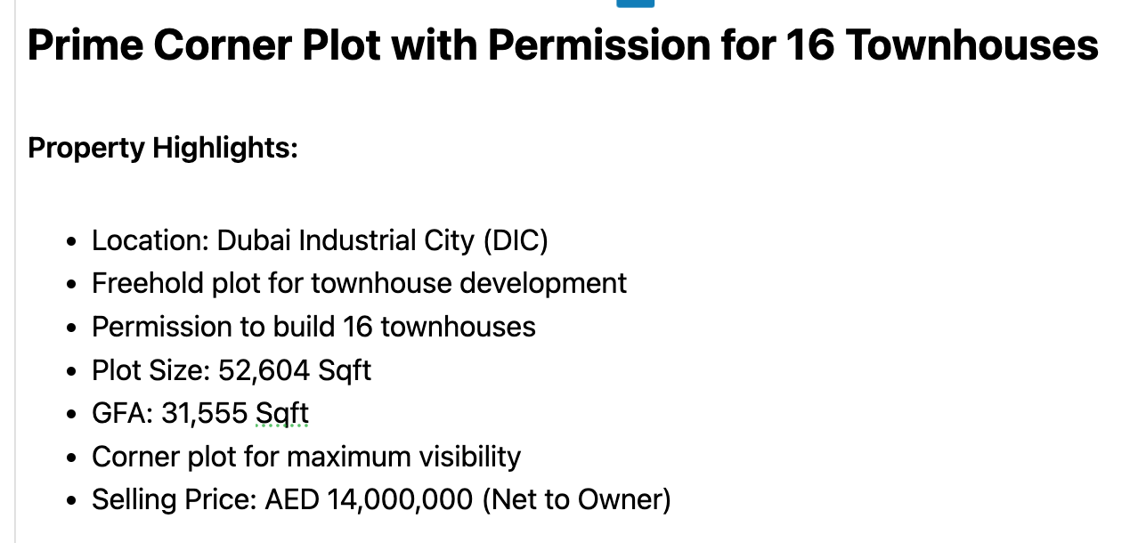Freehold townhouse plot in Dubai Industrial City for sale with permission for 16 units prime corner plot investment opportunity net to owner.