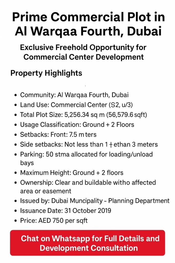 Prime Commercial Plot in Al Warqaa Fourth, Dubai Exclusive Freehold Opportunity for Commercial Center Development Property Highlights Community : Al Warqaa Fourth, DubaiLand Use : Commercial Center (C2, u/3)Total Plot Size : 5,256.34 sqm (56,579.6 sqft )Usage Classification : Ground + 2 FloorsSetbacks :Front setback: 7.5 meters Side setbacks: Not less than 3 meters Parking : 50 sqm must be allocated for loading/unloading baysMaximum Height : Ground + 2 floorsOwnership : PrivatePlot Status : Clear and buildable with no affected area or easementIssued By : Dubai Municipality – Planning DepartmentIssuance Date : 31 October 2019Price : AED 750 per sqft (Total: AED 42,434,700 )Call Us Now for Full Details and Development Advisory