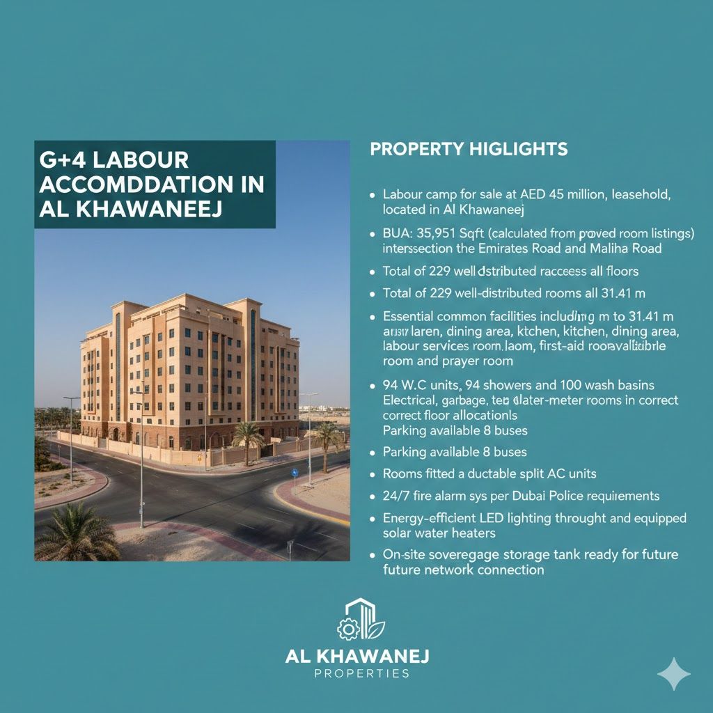 Labour accommodation in Al Khawaneej offered leasehold for AED 45 million featuring full facilities strong utilities and comprehensive workforce housing capacity.