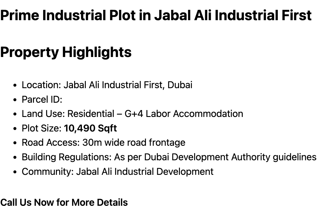 Industrial plot in Jabal Ali Industrial First 10,490 Sqft for labor accommodation prime location with 30m road access ideal for investment