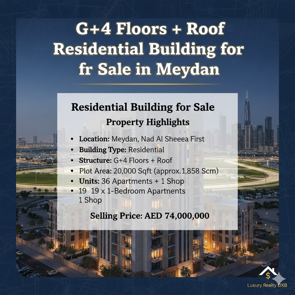 Ready residential building for sale in Meydan Dubai G+4 roof 36 apartments one shop excellent rental income and long-term investment.