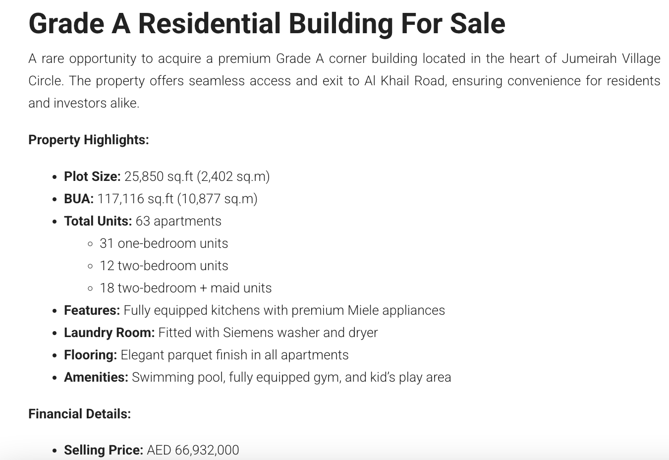 Meta Description: Prime Grade A building for sale in JVC. 63 luxury units, Miele kitchens, pool, and gym. Excellent investment at AED 1,000/sqft.