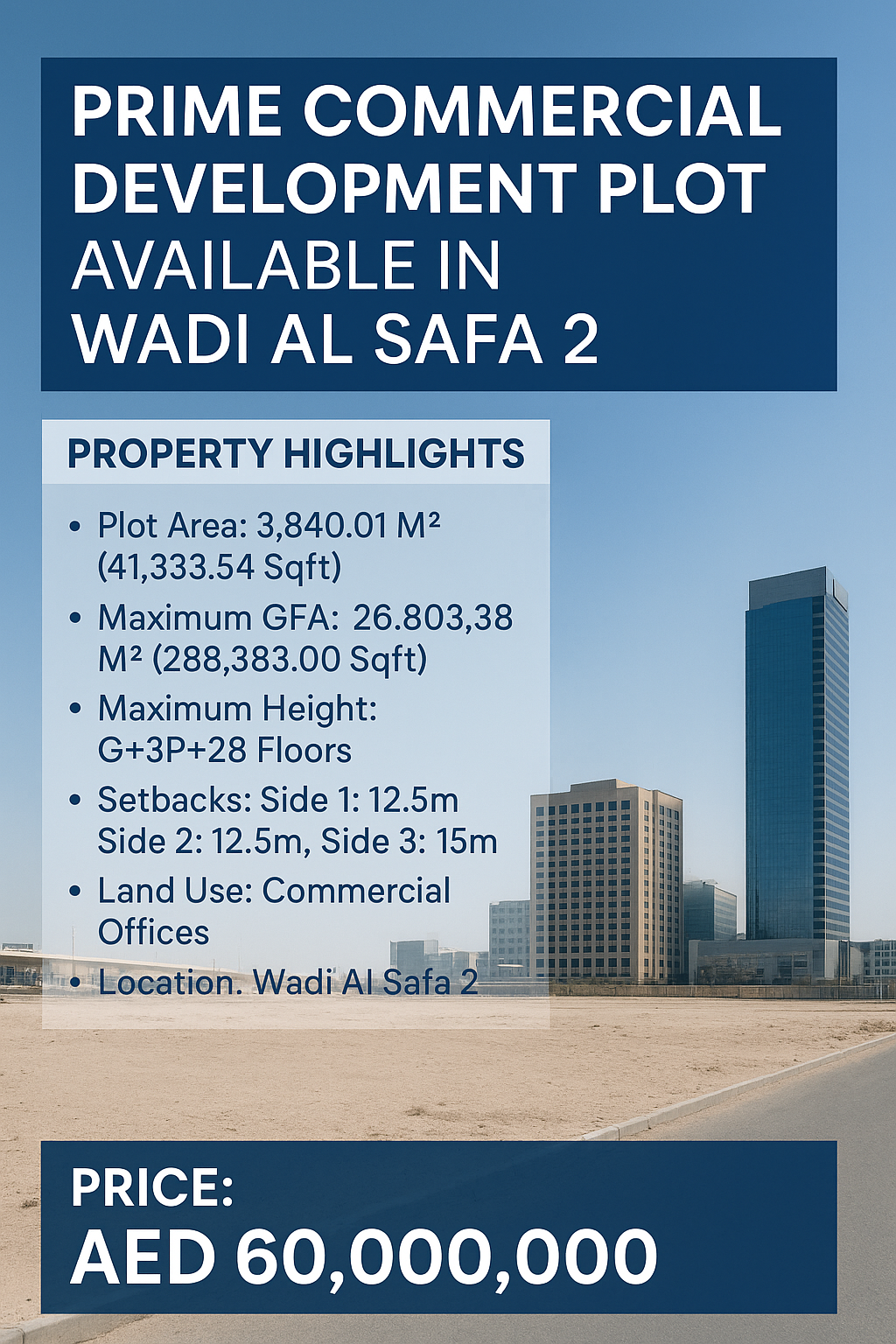 Commercial plot, Dubai offices, real estate development, plot for sale, Wadi Al Safa 2, high GFA, building plot, investment property