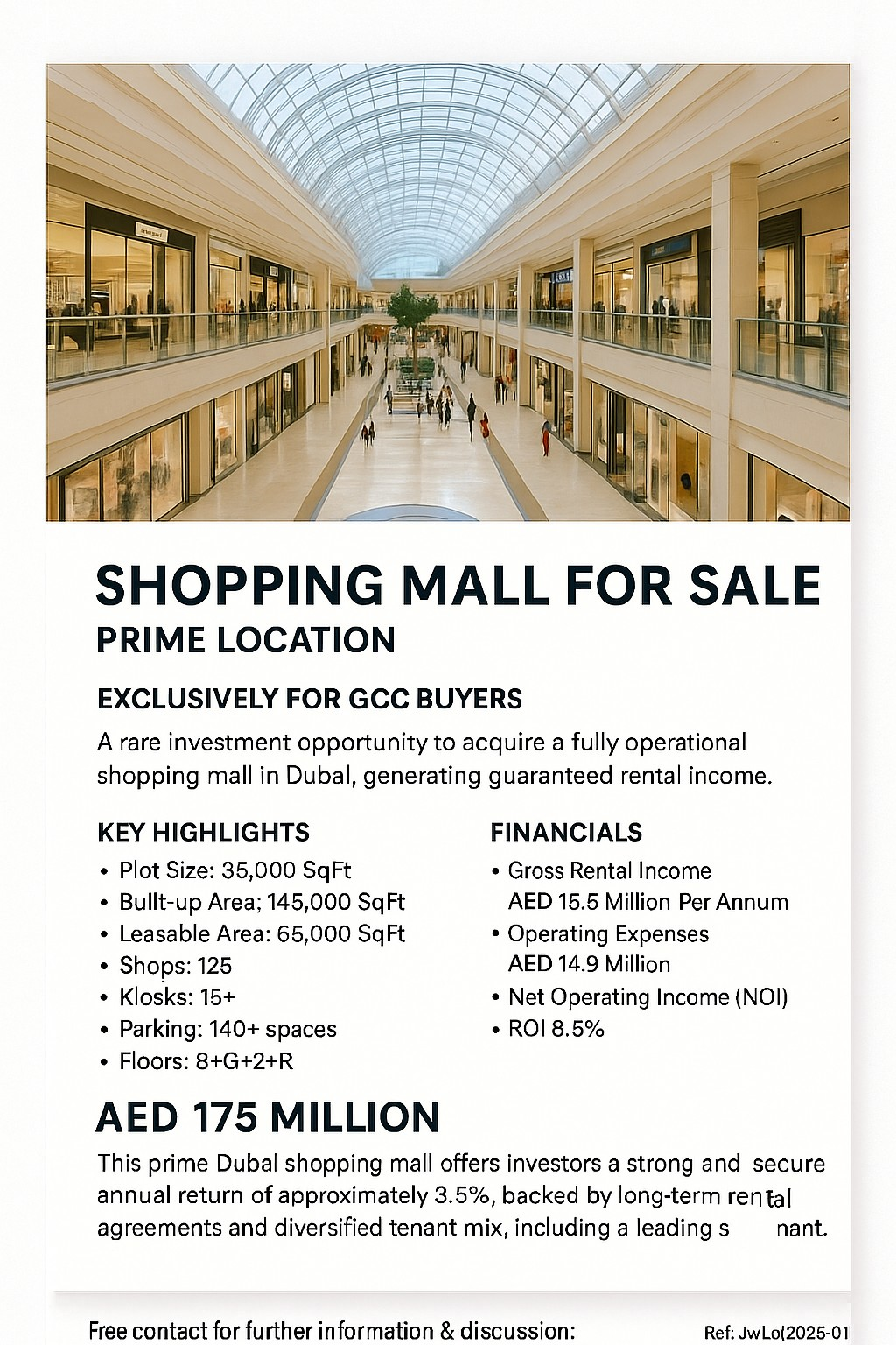 Prime Dubai shopping mall for sale. Secure 8.5% ROI with guaranteed rental income. Strong investment opportunity. Call us now.