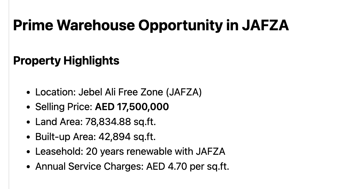 Spacious warehouse for sale in Jebel Ali Free Zone with prime location renewable leasehold large land and built-up area.